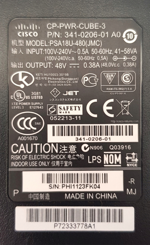 Блок Питания Cisco PSA18U-480 48V 0,38A 18W
