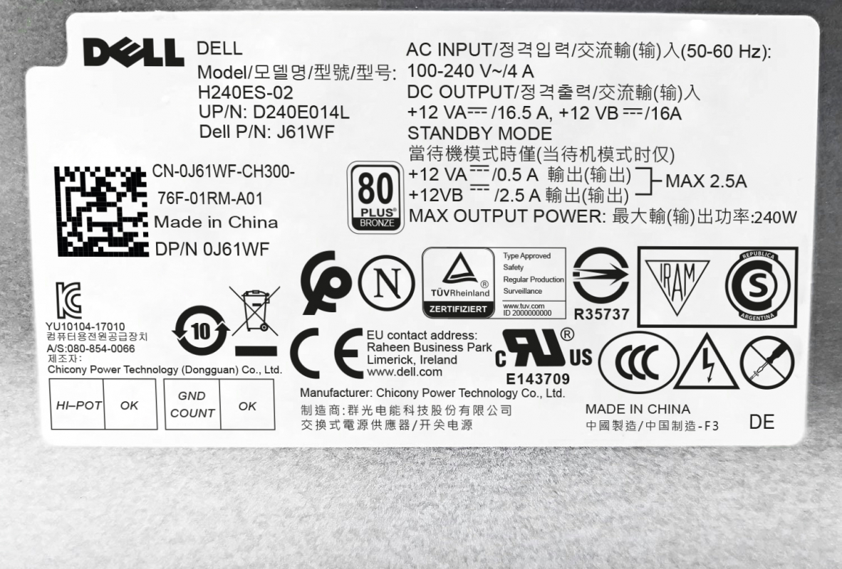 Блок Питания Dell 0J61WF 240W