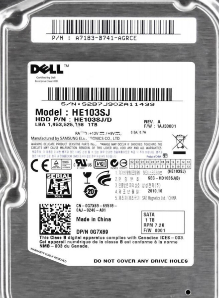 Жесткий диск Dell 0G7X69 1Tb SATAII 3,5" HDD